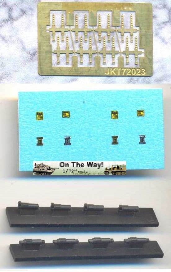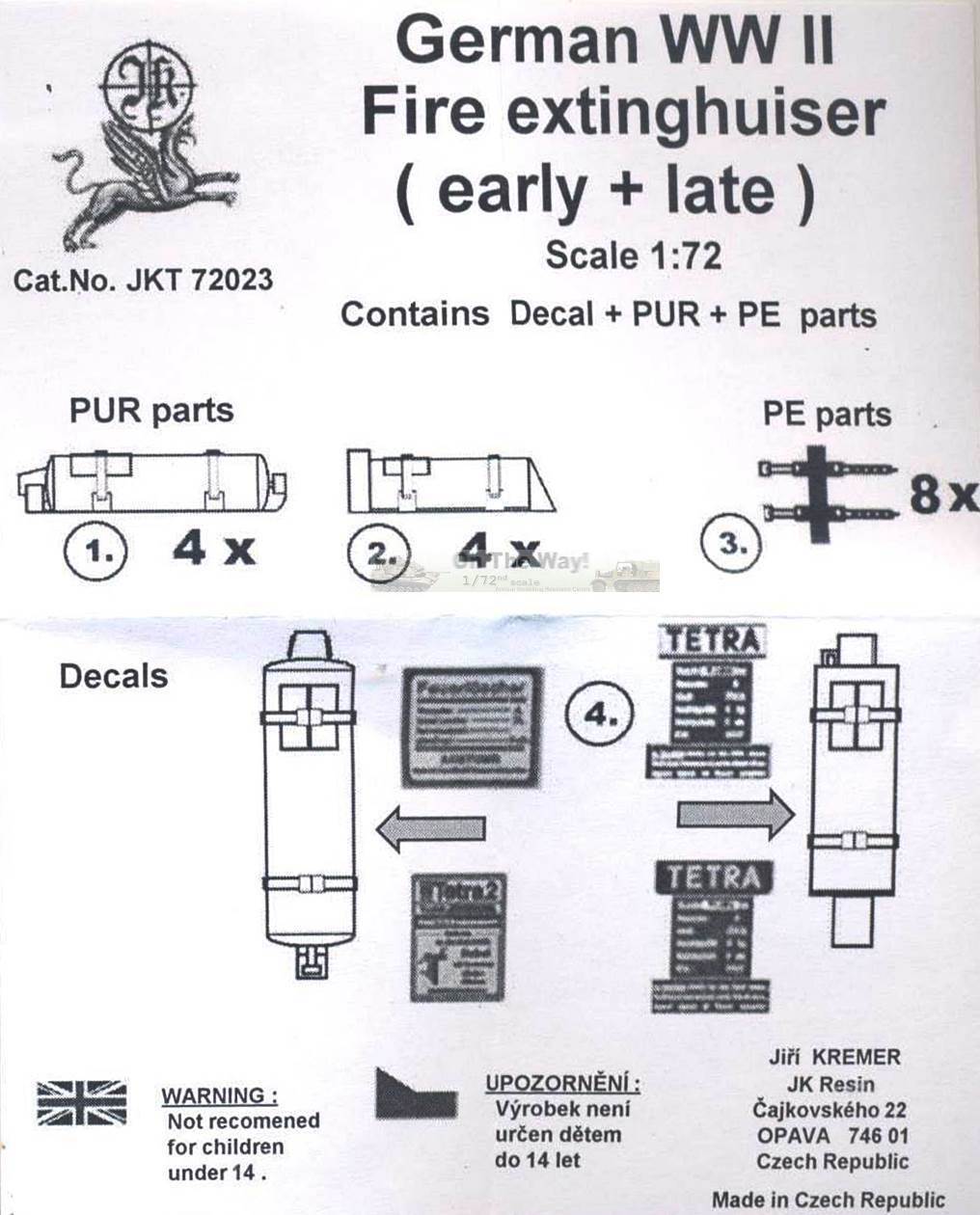 According to [1], the first was around 45cm long and the second around 42cm. Both had a diameter of 12cm. While it may be visually attractive to see red painted extinguishers on a model, they were actually painted in camouflage colors on combat vehicles. (A good discussion about these extinguishers can be found here.) For a simple item as a fire extinguisher, this set really raises the bar by a very wide margin, as it not only gives 8 exquisitely cast resin extinguishers, but also detailed clasps (in PE) and matching decals with lettering that is partially readable. The latter really is a novelty, even though these markings are rarely seen in period images of vehicles and equipment that has already seen some use. A note about the clasps: it seems that late in the war only one strap was used instead of the previous two. While the set mentions that the set contains early and late extinguishers, it doesn't tell which is which. The one on the right matches the Einheits-Tetra-Löscher, while the left one is close to a K2S Löschgerät, although not exactly. It might be that another type of extinguisher existed that I am not aware of. Measured against drawings in [1], the early type is about 5% underscale, while the late model is about 10% too small in length and 5% in diameter. In summary: this is a set that is light-years ahead of every aftermarket fire extinguisher that had been released to date.