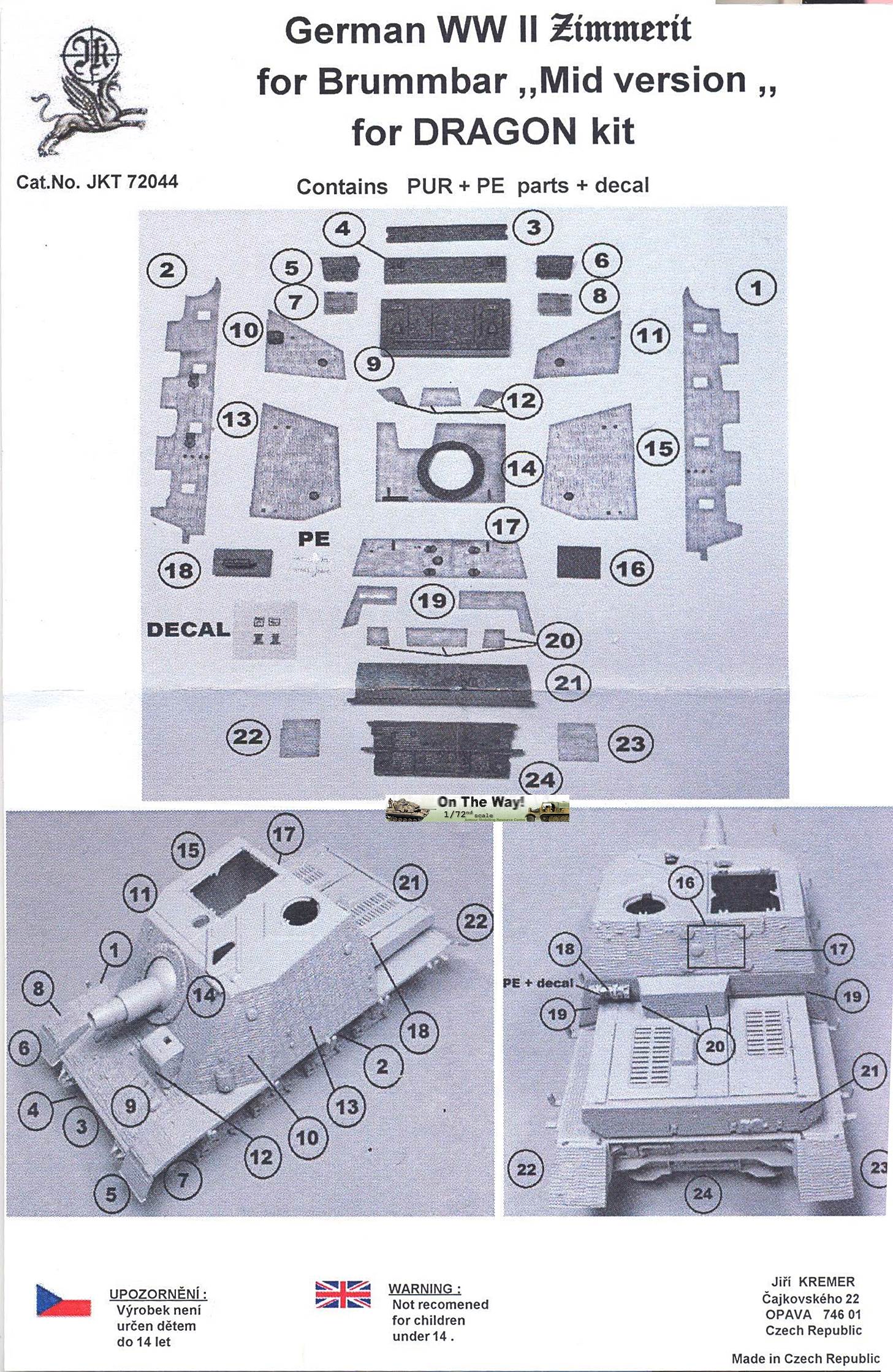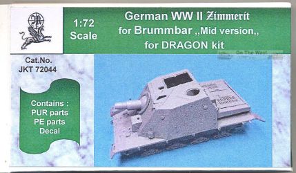 Dragon's "Mid version" (7242) represents a vehicle from the third series, where the best identifying features are the original superstructure, and (compared to the first and second series) the large collar for the gun and lack of driver's visor. All of these were produced in the period where Zimmerit was mandatory. Unfortunately, except perhaps for JK Resin, the Dragon kit does not come with Zimmerit, even though the boxtop shows it and Dragon is entirely capable of replicating Zimmerit.