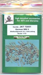 the WWI model. The parts are very delicately cast with very fine detail. Surprisingly for JK Resin, one grenade shaft was short shot, but apart from that, casting quality is perfect.. The Model 24 Stielhandgranate was stored in specially designed crates during transport, which could carry up to 15 individual grenades [1]. This is the subject of the sister set 72049.