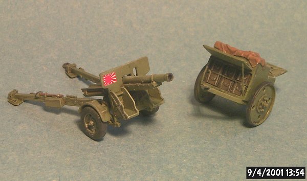 Overall the kit is very very nice with sharp resin casting, good accurate detail, and good fit of the parts. Suitable for war-gaming or a static display. This is a much better Japanese artillery kit than Fujimi's infantry gun. This is the only kit of this in braille scale I know of. It is the motorized version but I know of no towing tractors in this scale. Either of Hasegawa's Japanese trucks could be modified though. Substituting spoked wood wheels can convert it to the horse drawn version. The carriage is the same as the 75-mm Type 91 field gun so a little reworking of the barrel can make an easy conversion. For reference photos and historical info please check out: