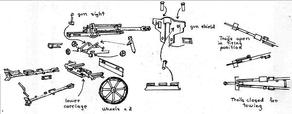 The scan of the parts above shows the good rendition of the pressed steel wheels next to the very well done shield at the lower right corner. At the top left is the bottom carriage and the two trails, both common with the Pak 40 AT gun. At lower right are the two pressed steel wheels with solid rubber tires and the shield.