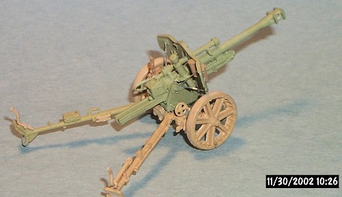 7M85 7.5-cm Feld Kanone: The 7M85 high velocity cannon (rather than howitzer) is not mentioned in the Schiffer book but is discussed in Ian Hogg's book (both books mentioned below). This was a German attempt to give the field gun units a better anti-tank capability and is an odd step backward in ways. The Pak 40 high-velocity anti tank gun was mounted on the carriage of the le FH 18/40 which is interesting in that the le FH 18/40 carriage is a modified Pak 40 carriage. The 7M85 cannon was produced with the le FH 18 shield, and with a greater elevation than the Pak 40. This should be an easy conversion using a Hasegawa, Al By, Modelkrak or ESCI Pak 40 gun with LEVA's shield and on LEVA's le FH 18/40 carriage and cradle.