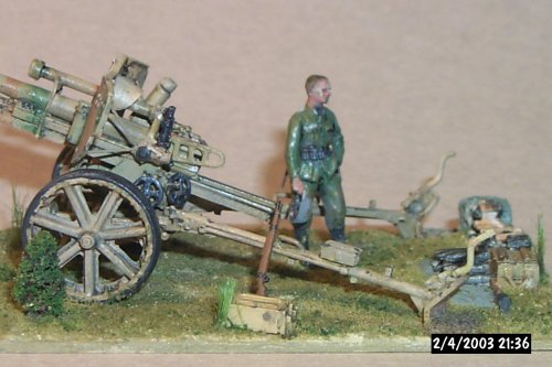 The le FH 18/40: This is the gun represented by this LEVA model. It actually is a combination of the original le FH 18, with the muzzle brake of the le FH 18(M) mounted on a modified carriage of the German Pak 40 anti tank gun and with the le FH 18 shield. This modification was an effort to make a lighter weapon and to standardize parts. It was not much lighter though and the carriage was stressed at high elevation firing. To address this extra stress, wings were added to the muzzle break to increase its efficiency. Pressed steel wheels with solid rubber tires, larger than the Pak 40 wheels, where given to raise the gun higher and therefore allow a greater elevation of the gun. Between March 1943, and April 1945, 10,245 le FH 18/40 were delivered (Engelman).