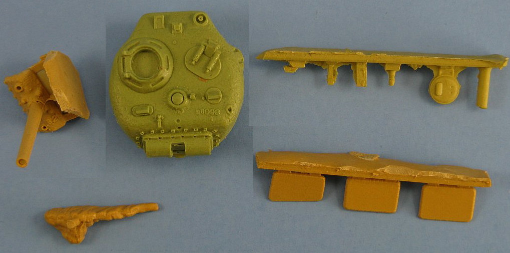 either an M4 (105), or an M4A3 (105)W. The turret is very nicely detailed, with a cast texture to the armor that may be only slightly overdone, but some careful sanding can alter that if one wishes. The commander's hatch is thankfully molded open, but the oval loader's hatch is unfortunately molded closed, and is incorrectly sitting on top of the turret armor, when it should be flush with the turret armor when closed. The machinegun is presented as wrapped in a protective shroud, which is an interesting piece, one I've not seen in any other set. The gun and rotor shield is another nice piece. The rotor shield measures perfectly to about 12.6mm wide, which is correct for a shield that has the bolted rim attached to it, as this one does. The shield looks hand-made, and while perhaps not quite as perfect as the MR Models piece, looks quite nice itself, with a decent cast texture and even some casting numbers molded on its surface, which is unique to this set. The gun barrel is molded nice and straight, but it is about 2mm too long, which will be easy enough to shorten up a bit. The applique armor plates are a nice touch for the set, but as it turns out, unnecessary. It is correct that the late model hull used on the M4 (105) was not a wet-stowage hull, and therefore needs added side armor. However, that particular tank was unique in that it had the side armor added to the inside of the hull, not the outside. So these pieces, which look to be correctly shaped, and easily be used for another project. I'm honestly not quite sure what all the small pieces are in the upper right of the scan. The turret hatch is obvious, and there appears to be an antenna stub, which is cool, but I really don't know what the other items are supposed to represent. All in all, this is a very nice set. Thanks to Alain Levesque of Leva Productions for this review sample. |