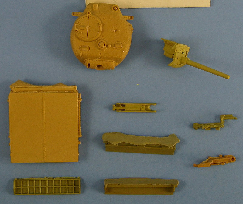 Overall this is a nicely done set, though with a few minor things needing to be tweaked. Firstly, the turrets that mounted this rocket launcher had the early M34 gun mount (with the narrow rotor shield), not the M34A1 as depicted here. Thankfully we have many choices to replace the rotor shield, both after-market or with spare parts from several different plastic kits. The turret included in this kit is an early turret with no loader's hatch, which is likely correct, though the photos I've seen don't show the turret roof to be sure. I would normally mention the commander's hatch being molded closed, but with the rocket launcher mounted on the turret, the hatch pretty much has to be closed, so... no complaints here. The armored covering on the mounting arm that connects to the gun barrel isn't shaped exactly correct, but that is a very easy fix. Note that the piece included in this set depicts the prototype mount (as shown in Hunnicutt's book), but the mounting arm used in the field was attached to the barrel's armored side protectors, rather than to the barrel itself as Stephen has done in these photos. But if you do mount it in the correct position it will also have to be shortened somewhat, as it will stand too high off the turret (the launcher was actually mounted very close to the turret roof, which was the major complaint against this weapon from the troops). And finally, there should be some square armor plates attached to the outsides of the side mounting arms. The mount arms and the box launcher itself are very nicely detailed, and as accurate as I can tell from the available photographs. It would have been nice had the rocket openings on the box launcher's front and rear been molded a little bit deeper, but that probably would have been quite difficult to mold. As I said, I think this is a very nice set. It needs only a couple of minor modifications and additions to make it into a very unique addition to my Sherman collection. Thank you very much to Alain Levesque of Leva Productions for this review sample. |