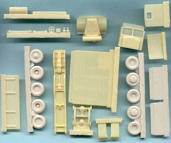 I would rate this as one of the better resin manufacturers of resin softskin models. Cab interior details are included. This model is also sold alone without the AA gun as a normal cargo truck. No canvas tarp is included (commonly not seen on Soviet trucks of the period). I did not check scale consideration but it appears to be 1/72 scale; following assembly we can check for sure if important.