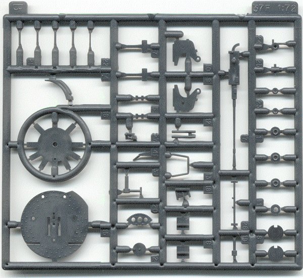 The injection molded 37-mm AA gun is very well done with many parts, and is delicately cast. You will have to hollow out the gun muzzle. Unfortunately no ammunition boxes are included. If you wish to just model a cargo truck this gun could be transferred to perhaps the Airfix S-boat model?