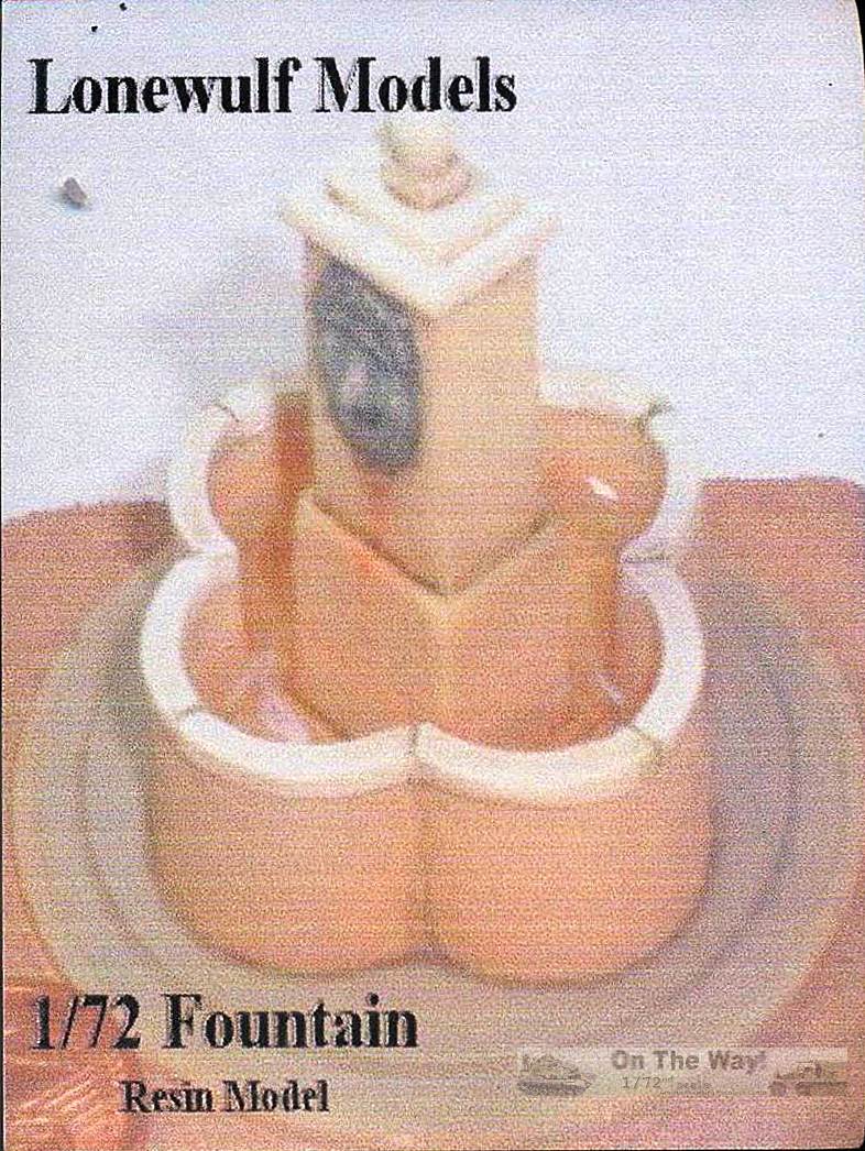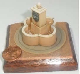 | This three-part set depicts an ornate fountain, typically seen in village squares. Casting is flawless; the only air bubbles that were found are in the pour blocks that need to be sanded down anyway. As a matter of personal taste, I would have liked to have a completely symmetrical fountain, i.e. one with the "head" depicted on all four sides of the central column. This head would, in my opinion, also benefit from a short piece of tubing to represent the orifice where the water comes out. The most