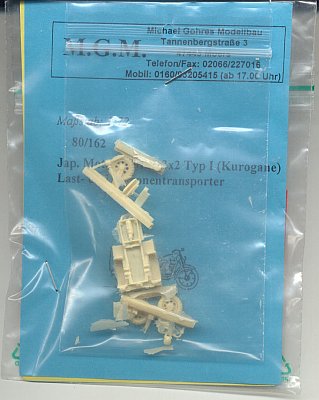 This motor tricycle was adapted from civilian use to serve as a light cargo vehicle and personnel carrier for both the Imperial Japanese Army and Navy. It had a V-2 gasoline engine, air-cooled, that drove both rear wheels through a differential. The model is composed of 11 resin pieces that come in a small resealable plastic bag. There are neither instructions nor decals included, just a small blue paper with the product information and a side drawing of the vehicle. This is a really cute little kit, well detailed all around, with only some light flash and a couple of plugs at the lower rear end of the cargo bed to be cleaned. From the few pictures I could find of this motorcycle, I think that the wheels on this model look a bit heavy and will need some work, but that’s a minor issue on what seems to be a fairly accurate representation. References: Lonesentry.com |