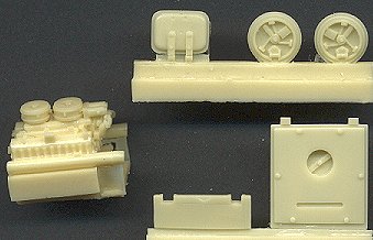 ![]() This extremely well-made set addresses two issues with the Revell Tiger kits: a complete engine compartment, and open crew hatches. The engine compartment is composed of a single-piece box compartment with interior detail, a fabulously-detailed one-piece engine, and engine compartment covers, detailed inside and out. The covers are provided for both the early and late model Tigers, so this set can be used on either the Ausf. H or Ausf. E kits from Revell. It looks as though the engine bay is a drop-fit right into the open hull, and needs only a good paint job to bring it alive. The following scan depicts a couple of the parts on their opposite sides to show more detail. Note that there is a difference between the left and right hull hatches, so make sure you attach them in their proper place.