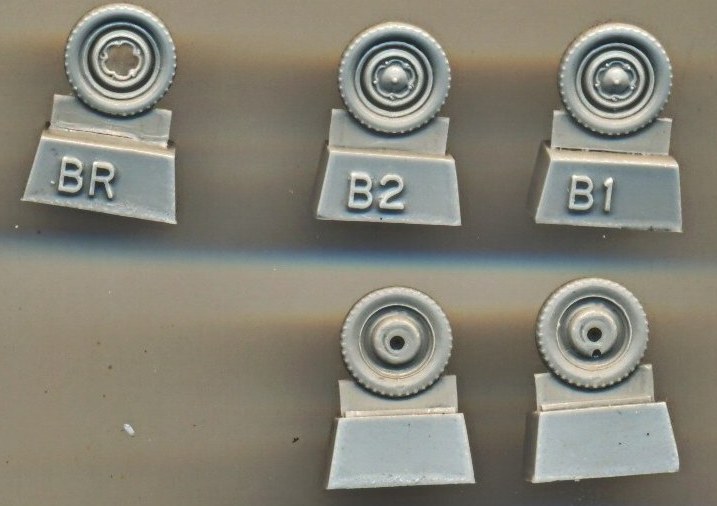 | This set contains five resin wheels. Two are marked "B1", two "B2", and one "BR". The latter clearly is the spare wheel, but it is unclear to me what the difference between "B1" and "B2" is. These wheels represent the most common