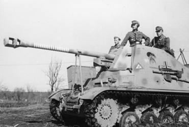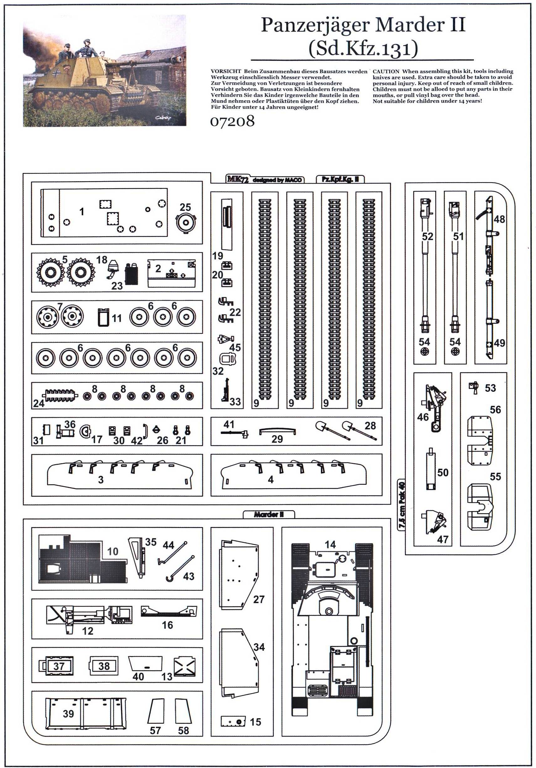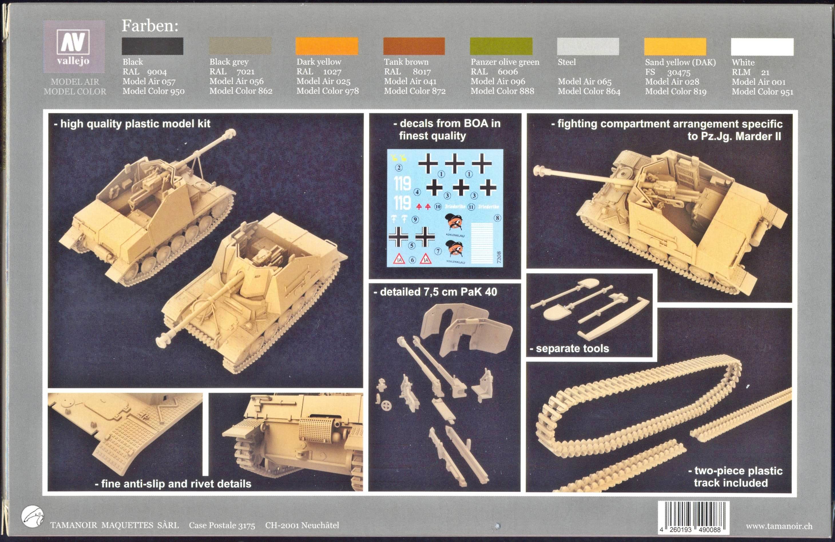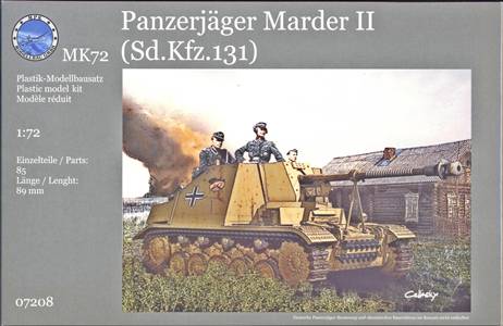 The Marder II (modeler's shorthand for Panzerjäger II für 7.5cm Pak 40/2 (Sd.Kfz.131)) was a German conversion of the Pz.Kpfw.II into an interim tank hunter. The first prototype was built in June 1942 and a month later the type went into production. Series production went on until March 1943, after which a small number were still being built by field workshops using obsolete Panzer II chassis (it seems Ausf. c.,A,B,C and F were used to this purpose). The latter had many visible differences and there even is one recorded example of a Marder II fitted with a 50mm gun. Most of the field conversions retained typical Panzer II features, like the fake driver's visor. [1]