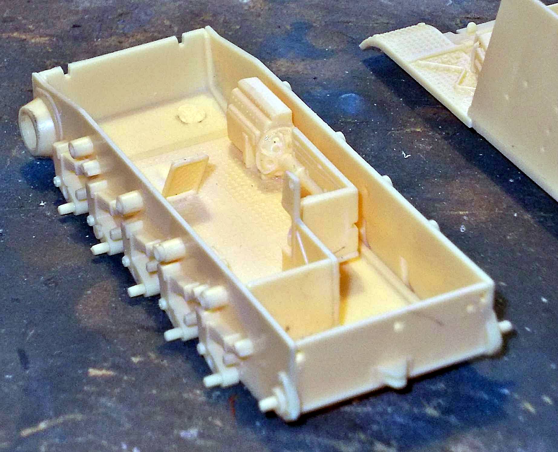 I first built the armored lower hull (the box like structure - step 1 in the instructions) and the interior assembly (step 6 and part of step 7).