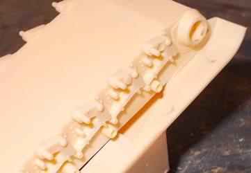 The ejector mark will be a little bit tricky to remove, but it's shallow, so a thick coat of acrylic paint inside the depression and some wet sanding will (hopefully) do the trick. Other ejector marks were found between the suspension. While the ejector marks on the upper armor need to be there for technical reasons, either on the outside or in the inside, and will require attention whatever the choice, MK72 could have done better by arranging the parts so that the ejector mark was on the inside of the hull, instead of on the outside where the presence of the suspension makes sanding very difficult.