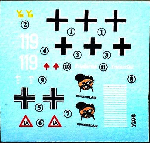 The decals went on smoothly, but notice that the Kohlenklau cartoon is a bit too large, as is the handsaw on the left armor plate (see pictures above of the real thing). This results in some interference. The triangle marking on the rear of the engine compartment likewise was hindered by the axe.