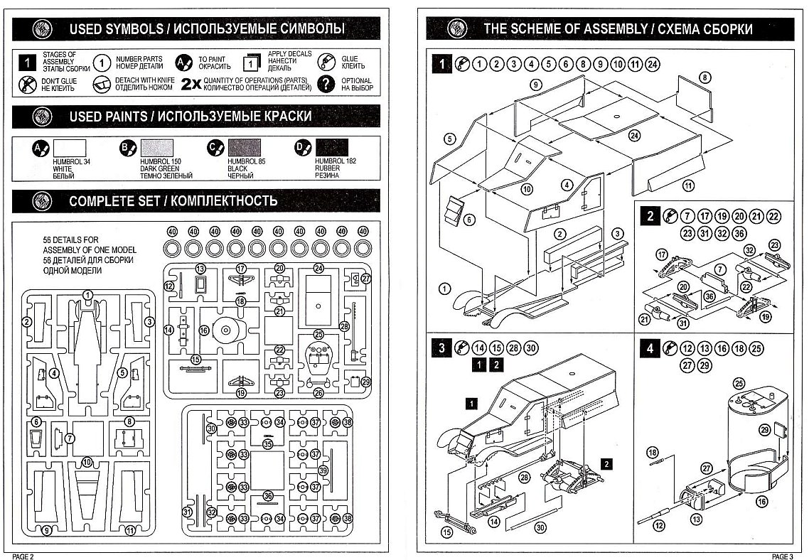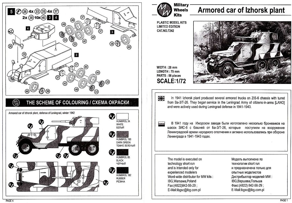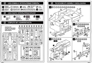 The model includes 47 plastic pieces spread over 3 sprues plus a set of 12 rubber tires. Most of the pieces are cleanly molded, only the turret has some flash. The whole kit is quite rough however: some pieces have heavy detail (raised doors and hinges on the body sides), while some have no detail at all (flat leaf springs). The parts for the armored body are really thick, the radiator armored air intakes are molded solid, gun and MGs are quite chunky and finally the turret, which looks like a copy from UM’s T-26/BA-3, lacks any detail. The rubber tires are the same that can be found on UM’s GAZ trucks. They are quite nice, but the material they are made of can melt the other plastic parts that come in contact with them, so measures must be taken to avoid this. There are no decals included but it seems that the real vehicle didn’t carry any markings. Instruction sheet images courtesy of Henk of Holland. |