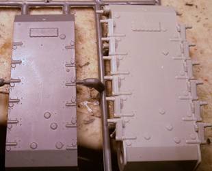 I have been on a bit of a StuIG 33 kick lately. I have bought two of the Attack 33b kits and I recently purchased the MW kit. I have also purchased an extra ACE sIG 33 gun to use in a kitbash. My brain has been thinking of ways to kitbash this vehicle into the best possible model. I have been inspired by Doug's article on the new MW kit and his original article on the options for this particular tank. http://www.onthewaymodels.com/reviews/MW/StuIG33_prev.htm http://www.onthewaymodels.com/articles/StuIG33compare.htm Both of these articles list the strengths and weeknesses of each model available. In my mind I determined to cross the best parts of the kits from Attack, MW and ACE gun. The MW kit has many good parts but the wheels leave a lot to be desired and as Doug says, they are "extremely poor." Here is a pic from Doug's review. I decided to replace the wheels with ones from a Trumpeter Stug III C/D kit - because they are better and I picked up a couple of them cheap on E-Bay. But then I started thinking, if I am using the Trumpeter wheels, why not use the Trumpeter suspension and upper deck? So I get out the two to compare them and to see if the MW fighting compartment would fit on the Trumpeter deck. Well, I found out that it would fit because IT IS THE EXACT SAME KIT!. The MW model is a casting of the Trumpeter kit. Both the upper deck and suspension are exact replications with only slight moderations and deletions on the MW offering. The evidence - MW on the left. As you can see, the MW kits has had the fender detail removed to allow the larger fighting compartment to fit. You can even see the places on the fender where parts were removed and sanded off. But it matches hinge for hinge, bolt for bolt. Even the crappy little bump tail lights and reflecters are the same. The suspension is also an exact copy. MW on the left. (Ed. note: it seems these parts are copies of the Revell Panzer III/StuG IIII kits, rather than of Trumpeter's, which means that some fit issues will arise.) Military Wheels does not have slide mold technology so they have broken up the suspension bucket into three parts (like in the ESCI olden days) but it is the same kit. But again it matches bolt for bolt, althought the detail on the MW kit is slightly "softer" as we would expect a second generation kit to be. MW on the top. Again only difference in the addition of the "hub" for the drive sprocket and some softness of detail. (Ed. note: again it seems these parts are copies of the Revell Panzer III/StuG IIII kits, rather than of Trumpeter's, which means that some fit issues will arise.) So bottom line is any kitbash with the Trumpeter kit should be very easy to say the least. I just wish MW would have "Bootlegged" the Trumpeter wheels, then some of this kitbashing would not be necessary. |