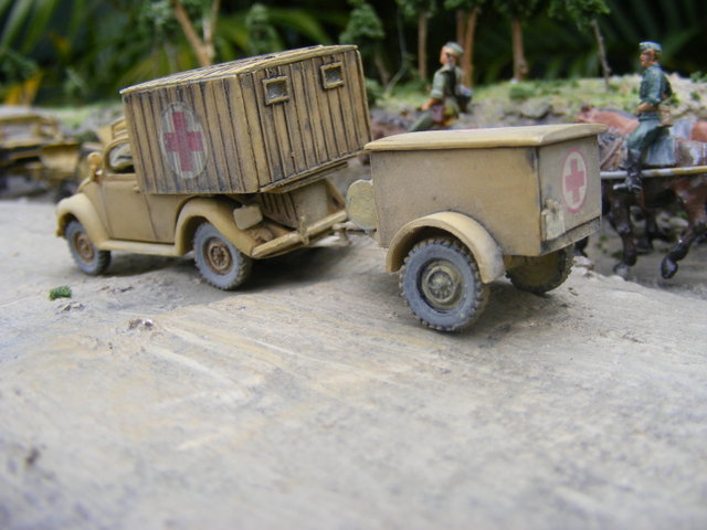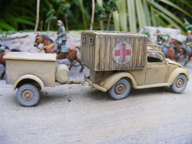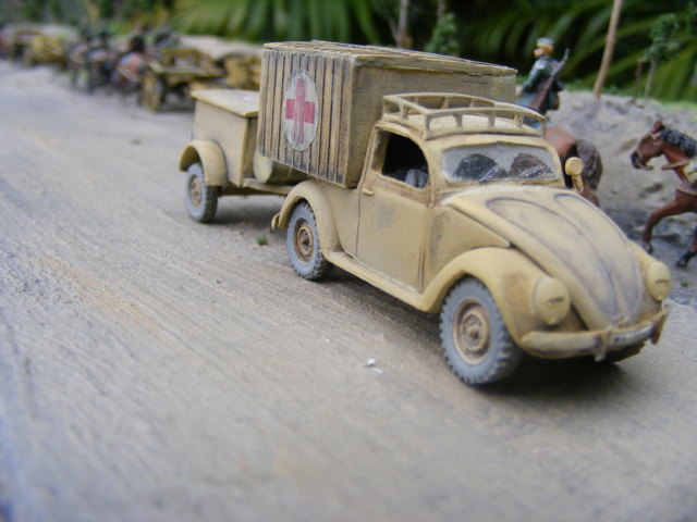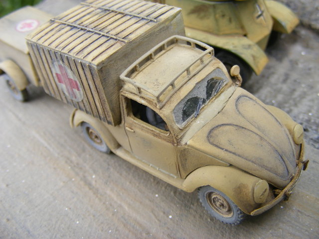 I started the MW 1/72 Volkswagen Type 93 Ambulance & Trailer last year - and I think as many of you know, despite not having many pieces, these MW Volkswagens are not a quick build, due to the main body components not being a good fit. As these VW models are the only ones on the 1/72 market, and as I have a fondness for VW beetles (since seeing Herbie in the Disney movies in the 1970s) I have persevered. I've spent more hours on this model than on kits with five times as many parts, but I feel it's definitely worth the effort. The VW Type 93 Ambulance Build In general the plastic of all components is very soft, so care is needed when filing or cutting, and removing from sprues. The plus side of this plastic is that its quite flexible - it tends to bend rather than break when (accidental or otherwise) force is applied, and once the liquid cement has bonded it is very firmly in place and can take a lot of pressure without breaking. Passenger Cabin The VW Ambulance (type 93) is comprised of about 50 pieces, having the same two piece cab shell as provide with the MW Volkswagen Type 825, the light truck tray variant, and has the same issues with lots of flash, poor fit, and no clear delineating line between where the cab roof, pillars, and the window area starts. This means very careful cutting and filing, lest you make the window opening too large. Much care is needed when clearing the flash and excess plastic from the front windscreen recess, with gentle filing and frequent test fit of the supplied clear plastic windscreen. Roof Rack The roof rack is made up of four pieces, and had cast lines and some flash, which needed very careful filing as it's quite fragile looking. I also thinned it down as the components looked overscale. I cleaned it up a bit, then glued it to the cab roof. After it had set hard (I always leave for a few days or more) it was set very solidly, allowing me to file it in place, much easier than trying to file these very small parts individually. Same with bumper bars - I found it easier to file the centre cast lines off these once they were firmly glued in place. Ambulance Body The ambulance box body went together fairly easily, but needed quite a bit of pressure to make the roof sit firmly in place while the glue set. I applied two bulldog clips to ensure good even pressure was applied. The back doors can be opened. I shut mine as it has no interior detail, and I wanted the trailer attached. Much filing was needed to make the body attach neatly to the cabin, as it has an access window from behind the cabin passenger set into the ambulance. Further filing was needed to get a good fit to the chassis. There is also a stretcher supplied, but I though it was fairly poorly moulded, so didn't use it. Bonnet (Hood) The distinctive curved Volkswagen bonnet (or hood depending where you live), is well cast but is too thick where it buts to the firewall, below the windscreen, so that it sits up too high and looks wrong. You need to use a fine flat file to thin down the rear edge so that it sits flush. Also it has two small scar shaped lumps on the surface near the front - I've checked all my VW kits and they all have this. These need to be scraped/filed off carefully otherwise they will mar the appearance. Windscreen The supplied windscreen is very thick, and has to fit into an aperture that has quite fine edges, and as described earlier, the moulding of this area is the least perfect aspect of this kit. It's not easy to cut/file a perfect aperture for the window, but if you fail to get this part looking right, it tends to spoil the appearance of the entire model. I obtained some Model Master "Clear Parts Cement and Window Maker" and attempted to make the front windscreen using that product. The window is about 15mm long and about 5mm high, and I was able to form a window with the liquid, no problem. It dried clear, with a few tiny air bubbles, but probably due to the amount of liquid I had to use, given the length of the aperture, it's not entirely flat looking, being a bit concave. If I press it from the inside it becomes convex, being quite flexible. For that reason I pulled it out, fitted the supplied window, and used a thin coat of the product over the entire window surface to fill the tiny hairline cracks where it wasn't a perfect fit into the aperture. (Note - this product works perfectly on all the other smaller windows of the VW sedan, as I have tried it on a VW sedan near completed. The front window is a bit too large though.) Not having window wipers supplied in the kit, and unable to buy any locally, I made some following a tip from Peter Bergstrom. I cut two small lengths of stretched sprue, and glued them together, one slightly overlapping the other one to represent the wiper arm, the other the wiper blade. Not as good as an etch one, but easy to do and free. Trailer The trailer, made up of 14 pieces went together with no extra work at all - everything fit very well. Painting, Decals & Finish The instructions suggest Humbrol 93 Matt Desert Yellow for the paint job. My tin of Humbrol 93 is brown, so I used Humbrol 83 with white added to lighten it up a bit. I painted the four main body components separately prior to final assembly (the cab, chassis, ambulance body and bonnet), and did the windscreen & wipers last. Then I used Winton oil paints, raw umber and soot black, very thinned down and applied with a 00 brush to bring out some light detail, then gave an overall light spray of dried dust/light mud, masking off the windscreen with a bit of cut "Post It Note", to cover the area that the wiper blades clean. A wooden toothpick, lightly applied can be used to remove dust, improving the size and shape of the cleaned window area. The instructions show different size red cross decals to place in five different places on the VW, but they only supply three, all the same size, which I decided to use on the trailer, and used two spare red cross decals from the Esci Opel Bli