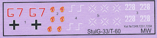 There is only one marking scheme included, though it is not identified in the instructions. The "G7" and black and white crosses on the left side of the decal sheet are for a vehicle in the 201st Panzer Regiment, of the 23rd Panzer Division in southern Ukraine during the summer of 1943. However, the G7 markings are supposed to be black, not red. Keep in mind, if one wants to model G7, then you must use the early idler wheels included in the kit. However, there is a question in my mind about the front transmission inspection hatches. This kit has the later style hatch hinges as seen on the Stug III Ausf. E or F, so one can assume that it represents a vehicle converted from a Stug III E or F. However, the idler wheel style was changed from the early to late style with the Stug III Ausf. C. Therefore, one would not expect to see a StuIG 33 (or a Stug III for that matter) with both the early idler and late hatch hinges unless the idler wheels were field replacements for damaged parts. The only photo I have seen of G7 is not clear enough to see the hatch hinges, though you can definitely make out the early idler wheel. So, either this kit is incorrect by including the markings for G7, or else we can make the assumption that G7 was based on the Stug III E or F hull, but had replaced at least its right-side idler with an early style wheel. The other markings on this sheet must be for the T-60 (whatever that is) because the decal sheet is labeled "StuIG 33/T-60". So all in all, I don't think this is a horrible kit, I was just extremely disappointed with its molding quality. Perhaps I had too high of expectations for it that were simply not achievable with limited-run technology. It is interesting how a person can form initial impressions based on only a couple of things, for example when I saw the wheels in this kit, along with the rear wall to the fighting compartment (the two most egregious problems for this kit), I immediately labeled the kit in my mind as "junk". Yet when I sit down to write a detailed review, I realize that it's really not too bad, it just has some problem areas that need to be addressed, just like most other kits on the market today. In my opinion, if one wants to make this kit into a really nice replica, you should completely replace the fighting compartment walls, taking the opportunity to open, or at least correct the crew hatches, and perhaps lengthening the compartment a bit to make it most accurate. Also, the road wheels need replacement, though that would likely mean sacrificing a Pz III or Stug III kit, since I don't think anybody markets replacement Pz III wheels. Some effort will be needed to clean up many of the smaller detail parts, but that's typical of a limited-run model. |