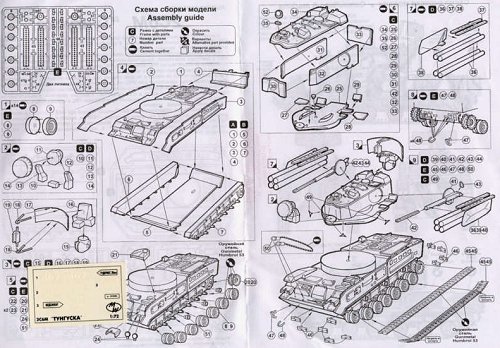 Instructions are printed on one sheet, unfortunately the decription of the weapon system is only Russian while the construction and colour notes are also English. The instructions are referring to Humbrol colours and a four side blueprint is depicting colour schemes which helps the modeller as well.