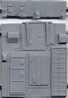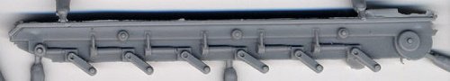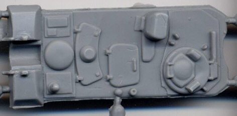My specimen had a big slice on the hull top hatches, I do not know if it is only on mine or a general molding error on all Tunguska models (note from Doug: my kit also had a flaw, but it was more of a sinkmark, not a cut like this one; I guess this is the price we pay for limited-run kits). I was also a little disappointed by the flat casting of the two 30mm barrels and it is a big step backwards seeing the kit molded with none of the hatches opened. The solid plastic will give you a hard time realising open doors. Pioneer tools were molded on again as well.