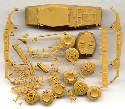 Ever since building one of these armored cars in 1/35th, I've been smitten by the wicked good looks of this vehicle. It's so sleek that the name of Puma is perfect. Long have I wanted one of these in 1/72nd, and who better to give it to us than MarS? Once again, this is a very complex and highly detailed kit. The resin casting is extraordinarily well done, with superb detail, and excellent casting quality. Some of the parts, such as the antennae, are packaged very carefully to avoid breaking, but it may be easier to replace those parts with wire anyway. The only drawback to this kit is the solid body and turret, where some other companies may have gone through the extra trouble to give us open hatches. But that is a minor complaint, and I highly recommend this kit. The instructions are first rate, but no decals are included. Actually, I do have one concern while looking at these parts: I don't like how they cast the wheels. It will take some careful and difficult grinding and sanding to clean them up. I assume they cast them in this manner to avoid losing any tread detail, but I would have rather lost some tread than go through the difficult cleanup process which now awaits me. Besides, when the car is sitting on the ground, it's easy to hide a small amount of tread loss.