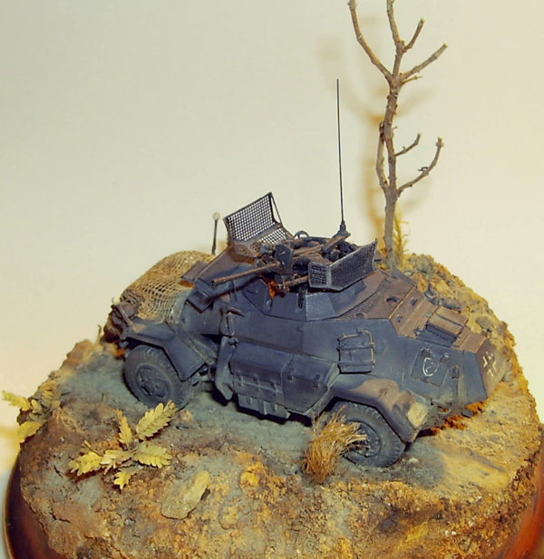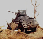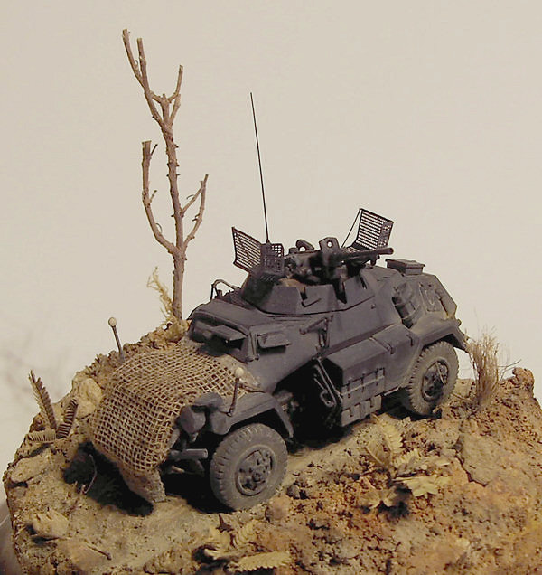 5. Instruction sheet: The instructions consist of hand drawn "exploded" sketches, which are not always 100% clear. The lack of numbering on the kit parts (which are very numerous) does not make it any easier. Because the parts are packaged according to their subassembly you can eventually figure out where everything goes. 6. Decals and painting options: None. As noted above, you would best look for the "Dietrich" (key symbol) badge and make this a LSSAH vehicle in the Balkans. Colors would be Panzergrau overall. 7. General Impression: Until recently this was by far the best Sd.Kfz.222 in this scale. (Ok, I can't compare with the Al.by kit, which should be very nice too.) It is not cheap, takes some care and attention to build and has a poor turret mesh and nose shape. But at least you can build it with all doors open ! The wheels are also very nicely detailed with a nice hub and thread pattern. Then the ICM kit came around. It is