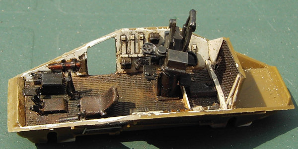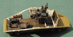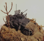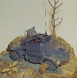 This resin kit has a lot more detail than ICM's to the point that it is somewhat over-engineered (especially the chassis). It is also more expensive, but you get a LOT of parts for your money. The interior is nicely done and well catered for, but still lacks some items, like personal gear (haversacks, gas mask canisters, ), MP40s, pioneer tools. If you really want to add some detail, you could also add the frame to the back of the driver's seat, which should be a bit more reclined as well. The gun mount is correct, and has nice detail, but the spent cartridge bags are missing. A very nice thing about this kit is that it allows you to open most hatches and visors. Pictures on the boxtop show an alternative type of hubcaps (with recesses and without hubcaps protectors), that I associate with LSSAH vehicles in the Balkan campaign [13]. I found the wheels of MarS' Sd.Kfz. 223 in my example (standard type, with integrally molded protectors). Stan (MarS) was so kind to send me a new set. The grating behind the turret is solid, but with texture added. It would be quite difficult to create a see-through effect without major surgery, but it is convincing enough with a suitable wash. The turret mesh frame is of the higher type, and is a weak part of the kit. The frame is quite chunky, and you are supposed to make the mesh itself from a piece of tulle that is included with the kit. I found the latter quite difficult to cut, glue and paint, but managed to a certain degree. You will need to add the support rods if you leave the mesh open. You get footsteps under the rear fender, these were (apparently) only fitted to late war vehicles (judging from the available photographs. The typical small plate on the turret in front of the optics is not provided, but is easy to make from some plasticard. Mars gives you turn indicators with cage and width indicators. The latter are quite thick for this scale. (More about them later.) The worst fit I encountered in this kit were the exhaust, and I ended up making new tubing and carving cut-outs in the rear fenders.