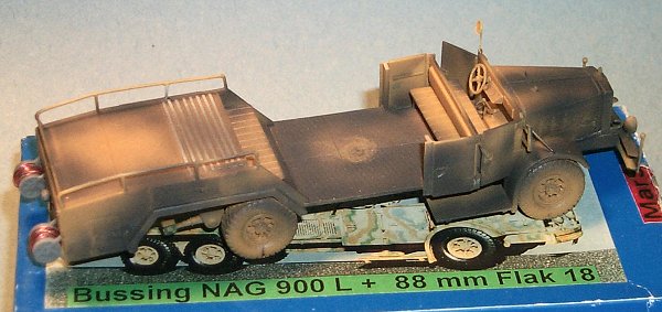 This World War 2 era German self propelled Flak truck was based on the Büssing Nag truck companys 9-ton truck chassis. Its purpose was to provide a very mobile antiaircraft artillery unit that could quickly move to an area with a minimum of set up time. Its cousin was the very similar Vomag Company self propelled Flak truck with almost the same body and gun mount. Whether this truck ever saw service is presently in doubt. One account I have heard is that they all were destroyed before deployment when the factory where they were built was bombed, or perhaps the factory they were protecting was bombed. MarS instructions state that were destroyed by bombing, while four survived and were destroyed in the final days of the 1944 - 1945 Soviet assault on Budapest, Hungary. (Where I understand the unit armed with Vomag Flak trucks was also destroyed. Likely the same unit?)