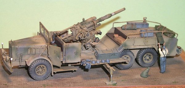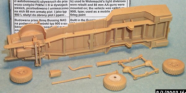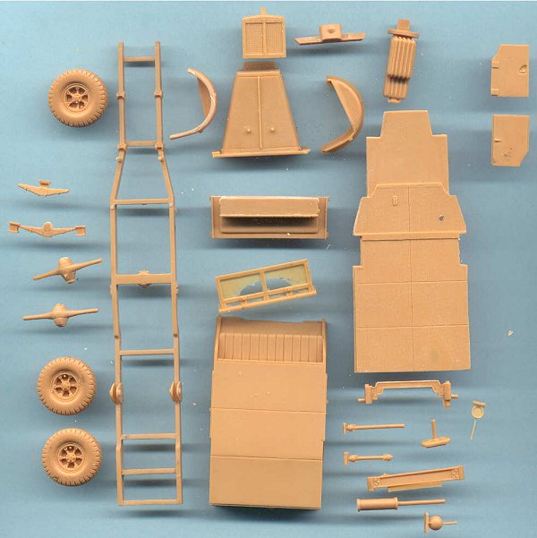 The kit comes separated into a ziplock bag of truck parts and one bag of 88-mm Flak gun parts; all in a cardboard box which is all typical of MarS kits. There are approximately 80 tan resin parts (there were actually so many tiny parts I gave up counting them). Resin casting is the typical crisp, superb MarS quality. Clean-up of pour plugs and sprue was not to bad. Be very careful to wet-sand all parts flat and true.