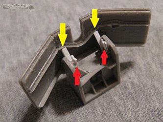 lower front part of the mount (red arrows in below left photo). The upper braces are sections of angle styrene rod (yellow arrows in below right photo). The red arrows