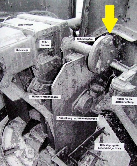 noted that the end of each trunnion was missing the prominent disk as well as the bracing between the mount and the shield. The trunnion issue I find particularly odd