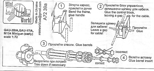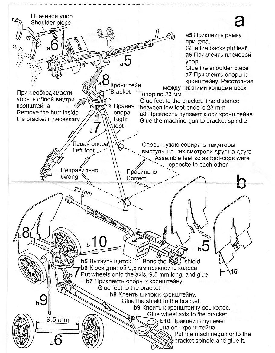 The instructions are provided on a small sheet with captions in both Russian and English. A brief note provides basic colour information for the gun.