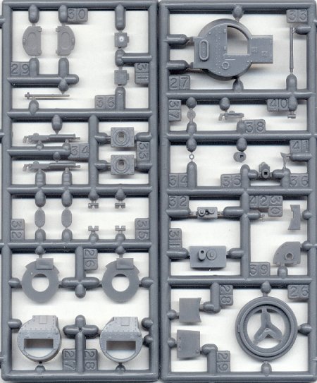 This scan shows two wheel sprues, front and back, but only one comes with each kit. Like the sprockets, the idler wheels are very detailed. The road wheels are a little plain: just like the real items.