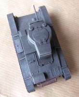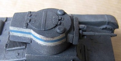 The turret is completely scratch built. The basic shape was made of plastic sheet rolled and glued into conical shape and sanded into correct height. The rear extension was made of plastic sheet, as was the turret hatch. The hinges were made of foil and the roof ventilation cones were confiscated from the Mirage kit. The mantlet was constructed of plastic beams and rod sanded into shape, while the gun itself is the erroneous Mirage offering (cal. 37 mm), its barrel somewhat shortened. I did not carve the side vision slits, and neither did I carve slits on the hull sides. After figuring out how to approach the turret construction there were no particular problems, but without good photographic overview of the top of the turret I ended up making the hatch too wide. The real Vickers was put together by rivets, which defines its appearance quite a bit. The Skif kit sports no rivets, and as I did not care to reproduce them, my Vickers ended being definitely too "smooth".