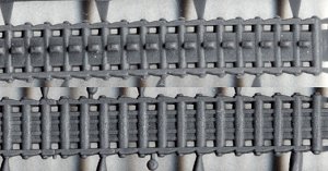 These tracks are definitely better than the tracks included with the Skif T-26 kits, and even better than the metal tracks in the Modelkrak resin kits. Luckily, PART has recently released etched replacement tracks for the Vickers series of tanks. We have around 20 [resin and/or plastic] kits which can benefit from tracks in etched brass.