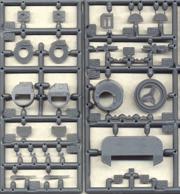 This scan shows two turret sprues, but only one comes in each kit. The left sprue is for the Mk. B (twin turret) kit, and the right sprue is for the Mk. A (single turret) kit. The turret hatches are molded open, again with separate handles. They've even included the gun breaches, thereby providing some detail inside the turrets. This is the only part of the kits which lack bolt detail - around the turret sides. I guess they could have chosen to mold the curved sides of the turrets in two halves, but even then, it would be difficult to add the bolt detail to the curved surfaces.