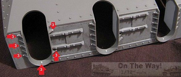 - Add more rivets to bottom of gun openings and their side braces. (red arrows w. white 3)