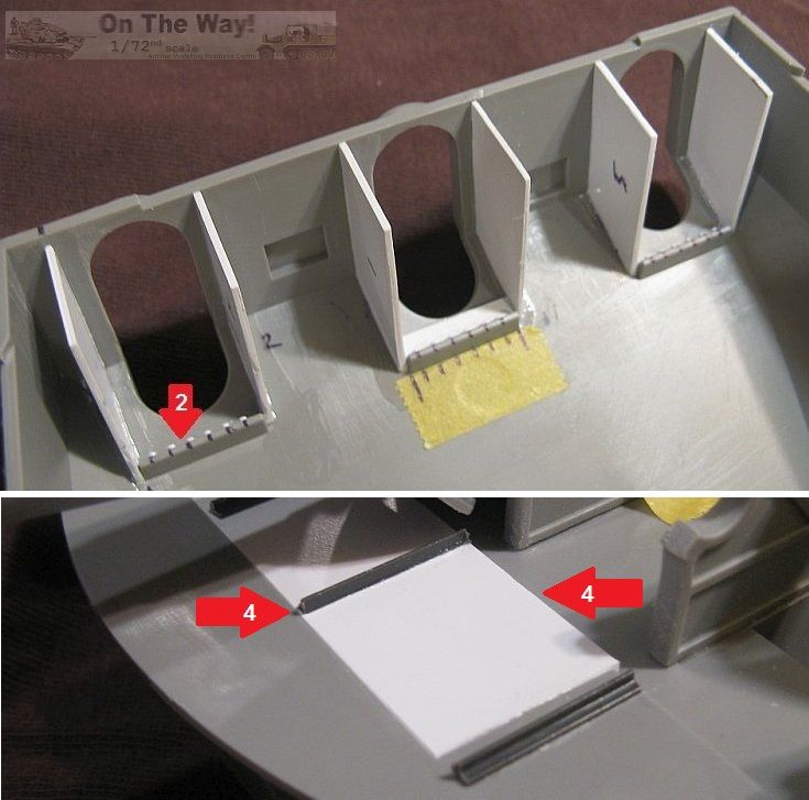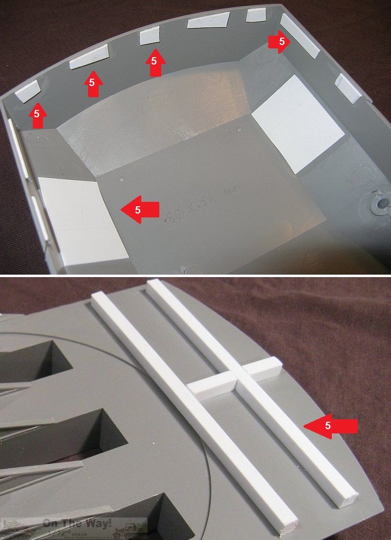 under construction on the cruiser from ref. [2] shows them even better (yellow arrows w. black 1 - middle photo). So walls were constructed from plastic sheet. A