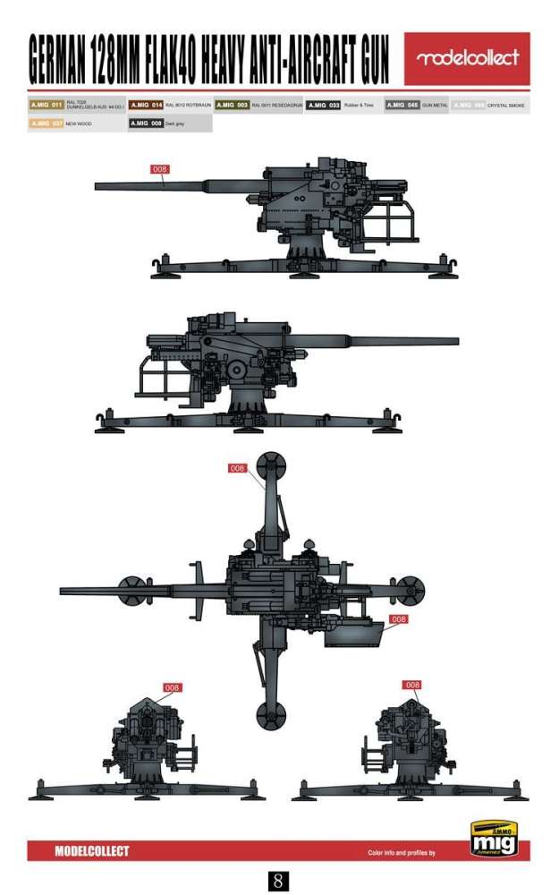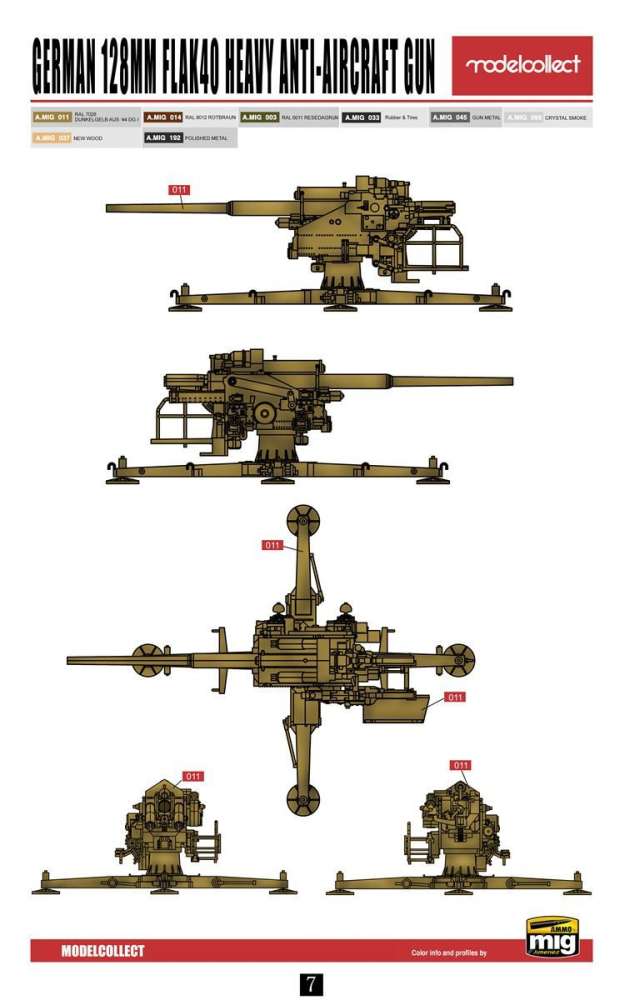 kit. One Flak 40 has been preserved in the Wehrtechnischen Studiensammlung Koblenz. This makes it possible to check the accuracy of the kit. To be honest, Modelcollect has done the job very well. The complex aiming and fire control system are replicated in great detail, with all buttons, shafts and rivets where they should be. In recent years, the new company Modelcollect has built a reputation of extremely well detailed kits and this gun is no exception to the rule. For modellers who like to participate in modelling contests: this is the type of kit you can turn into a winning model. For those who like to make dioramas: a number of spare shells are also included. The crucial part of the kit is the impressive gun barrel. Unlike some other kits in the Modelcollect range, you do not get a metal barrel. You will have to glue two halves together, with the inevitable task to make the joint invisible. Luckily, the parts fit well and give only a small joint. By successively sanding with 2000, 4000 and 6000 sanding paper, I was able to remove the joint quite easily. The same has to be done with the gun’s breach block (somewhat more difficult) and elevation mechanism. Often, also ejection marks are a delicate point. As Modelcollect is a modern company, they have taken this into account when designing the kit. All ejection marks are situated on places where they will not be visible when your kit is finished. The one exception are the ejection marks on the inside of the side supports of the gun. As the inside of these supports is completely flat, it should not be a problem to hide them with the magic duo ‘filler + sanding paper’. Some critical remarks remain for the building instructions. Some steps in the building process require a close look as the instructions are not always that clear. A pity is also the lack of detail in the painting scheme. Modelcollect suggest two options: German grey or German dark yellow. The example at the Wehrtechnischen Studiensammlung Koblenz however suggests much more detail (e.g. control wheels and instrument panels in black, several buttons and handles in red). No painting details are revealed for the shells either. These have almost the size of a man, so they are large enough to be painted with a lot of detail. Conclusion: A highly