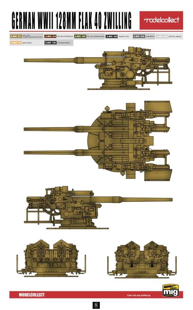 The kit For modellers who have always been impressed by the biggest anti-aircraft gun the Germans ever made, the Modelcollect kit finally is a nice chance to build the Zwillingsflak 40 in plastic. Never before, this gun was produced as a regular plastic kit in 1:72. For the die-hards, there was only a resin copy by the Romanian company Wespe Models, but this resin kit is now discontinued. Besides, there is no need any longer to venture on a resin kit as the Modelcollect kit is a nice replica of this awesome anti-aircraft gun. The kit consists of four sprues. One sprue contains the circular gun platform, intended to be bolted onto a flak tower. Two sprues are for the guns themselves. One of these sprues is identical on the sprue you find in the single Flak 40 kit, with the other sprue being the opposite version. The fourth and last sprue is the gun’s elevation system. You also find this sprue in the single Flak 40 kit. One Zwillingsflak 40 has been preserved in the Aberdeen Proving Ground in the US. Although this last survivor is now in a sad condition, it gives us the opportunity to check the accuracy of the kit with the real model. As with the Flak 40, Modelcollect has done a superb job. Just everything is in place where it should be. All buttons, shafts and rivets are replicated in great detail. If you want to superdetail the kit, you could add some tubes and electrical wiring. With the help of good reference pictures, these can be easily modelled with lead wire. The crucial parts of the kit are the impressive gun barrels. Unlike some other kits in the Modelcollect range, you do not get a metal barrel. You will have to glue two halves together, with the inevitable task to make the joint invisible. Luckily, the parts fit well and give only a small joint. By successively sanding with 2000, 4000 and 6000 sanding paper, I was able to remove the joint quite easily. The same has to be done with the gun’s elevation mechanism and breach blocks. The latter is somewhat more difficult, but luckily the joint in the breach blocks can be camouflaged behind another part. There is also good news for those of you who like to make dioramas. A number of spare shells are also included. But even better is the announcement of Modelcollect to make a kit of an anti-aircraft tower. Four of these kits would even make a replica of the entire flaktower in Hamburg. Some critical remarks remain for the building instructions. Some steps in the building process require a close look as the instructions are not always that clear. A pity is also the lack of detail in the painting scheme. Modelcollect suggest two options: German grey or German dark yellow. A surviving example of the Flak 40 at the Wehrtechnischen Studiensammlung Koblenz however suggests much more detail (e.g. control wheels and instrument panels in black, several buttons and handles in red). No painting details are revealed for the shells either. These have almost the size of a man, so they are large enough to be painted with a lot of detail.