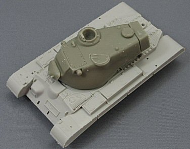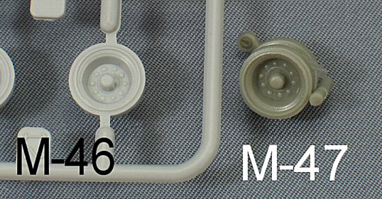 The tracks On inspection of the tracks, I discovered a regular pattern of ejection marks. On a resin kit??? This bewildered me at first until I got myself the M46 Trumpeter kit # 7288 (which contains link & length plastic tracks). I compared the Model-Miniature tracks with the Trumpeter ones and found both sets have their ejection marks placed in a similar pattern. I therefore can only conclude that the M47 resin tracks runs are a slightly adapted copy of the Trumpeter ones, made longer by gluing some links to them. However these M46 tracks are the T80 steel type, which were only used on the earlier M47 tanks. The type most commonly used with the M47 is the T84E1 with the rubber chevron. |