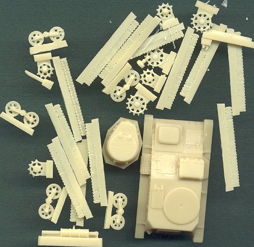 The majority of the model is made up of chassis parts: lots of tiny wheels and track pieces. Once again, this is a fairly simple kit, but with superb detail. As you can see, the sprocket wheels are missing teeth where the track wraps around the wheels, which eliminates the step of having to cut off the teeth yourself. It is a solid body kit with all hatches molded closed. I am disappointed, however, in the tracks. The inside surface is good, with delicate track guide teeth molded in two rows, but the outer surface is bare. Each link is distinct, but there is no tread detail on the individual links. Granted, these tracks are very small, but some amount of detail should have been possible, and will now need to be added by the modeler.