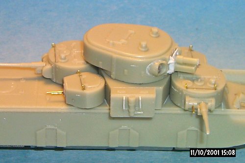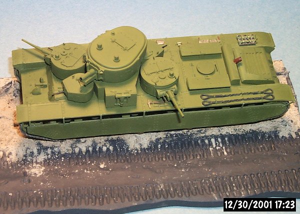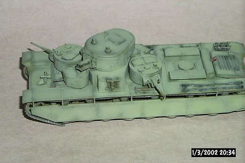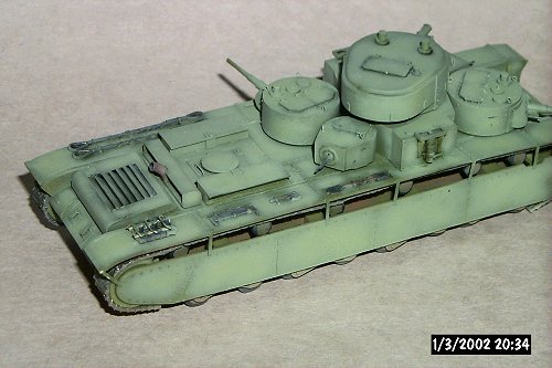 Photo 13. A view of the rear of the T-35, at the same stage as in the above photo #12. This post-shading is a step in really bringing out the model detail and making it more three-dimensional. The recessed areas, such as behind the turrets areas are less prone to fading by the sunlight and wear and thus have less or none of the light post-shading color, to give an impression of being in-shadow.