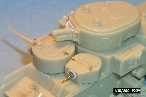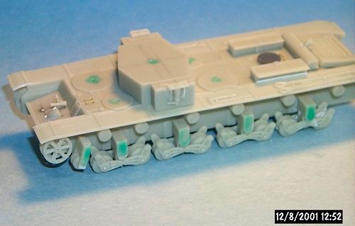 The model consists of approximately 80 very well rendered, amber, cast-resin parts. This includes one central 76.2-mm howitzer turret, two smaller 45-mm high velocity gun turrets, and still two smaller rifle caliber machine gun turrets. The tracks are resin cast with precisely defined guide-teeth, in two different lengths, and with plenty of extra. Hand tools and tow cables are molded onto the fenders but these are undercut and done capably. There are plenty of small rivets all over the side skirts, turrets, hull and chassis and these too are done very well and in-scale.
