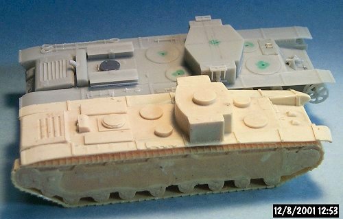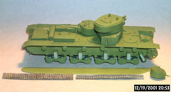 Photo 7. Partially assembled 1/72 scale Modelkrak T-35 in the background, with the smaller, 1/76 scale Red Star resin T-35 kit in the front. It is evident that the Red Star model is a less refined kit as far as a display model, particularly as far as the one-piece suspension & tracks, hull fittings, and engine grill. The shape of the hull superstructure is different though it appears they are the same T-35 variant