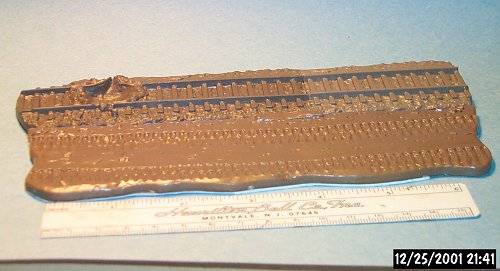 Photo 10. The Base: The model is over 13 cm when complete and needed a long base for display, protection during handling, and theft at model shows (yes this has happened to me and others, and a base makes a model that much harder to pocket!). Using extra diorama bases from Matchbox kits, I mated two pieces end-to-end from Matchboxs 1/76 scale M-17 halftrack kits, and a roadway from Matchboxs M-20 tank transporter kit.