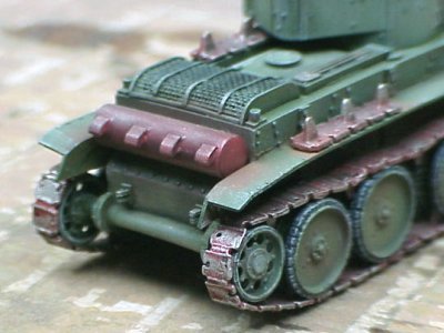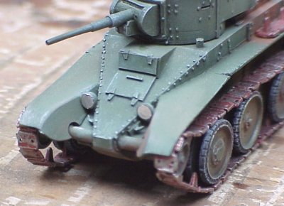Aside from those two difficulties, construction was very easy. I spent a good deal of time trying to smooth over the line where the front fenders attached to the side fenders, only to notice in photographs (after the fact) that there was supposed to be a pronounced line/ledge where the two fenders connect. So if you decide to attach the fenders, don't bother trying to make the attachement point disappear. I say "if" you use the fenders, because many BT-5's did not have the fenders attached, so these are optional parts.