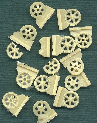 Beautiful wheels. They look a little rough in the photo because of all the flash, but once that's cleaned away, these will be absolutely gorgeous. Some of the wheels are broken in half because they are so delicate. Perhaps in the future, ModellTrans may consider packing these in a hard plastic "blister pack" instead of only a zip-lock bag. This would protect them better when shipping.