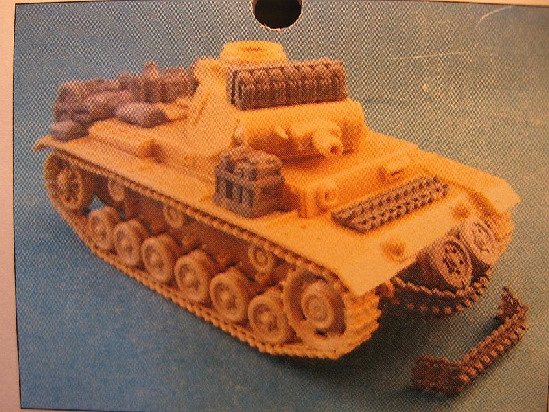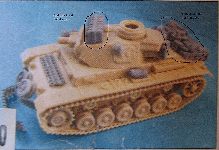 three Panzer IV wheels and not Panzer III wheels. I got the pith helmet, a small barrel and a triangular oil can. Two pieces of track look close to the picture on